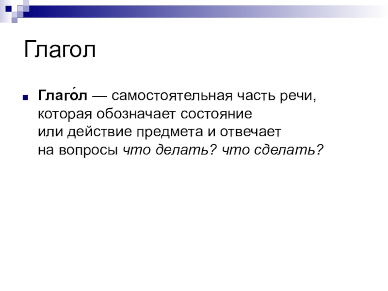 Глаго́л — самостоятельная часть речи, которая обозначает состояние или действие предмета и отвечает на вопросы что делать? что сделать?
