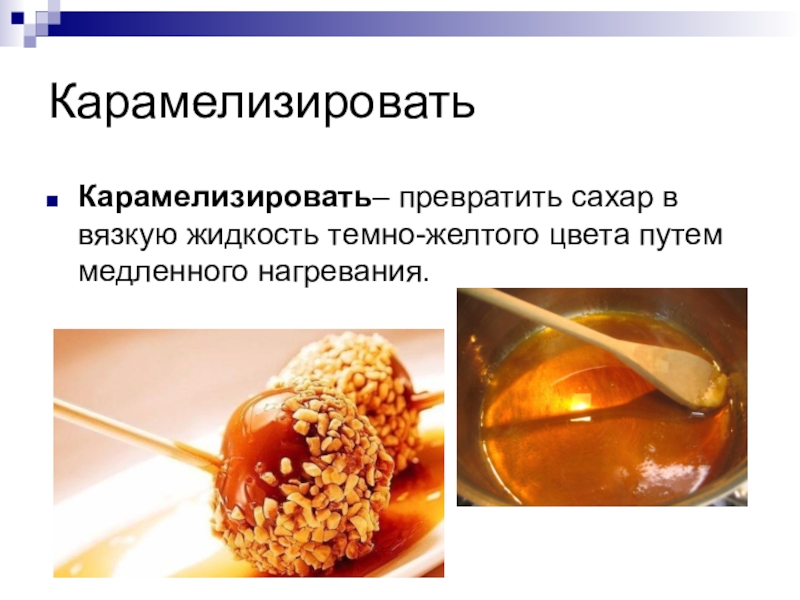 КарамелизироватьКарамелизировать– превратить сахар в вязкую жидкость темно-желтого цвета путем медленного нагревания.