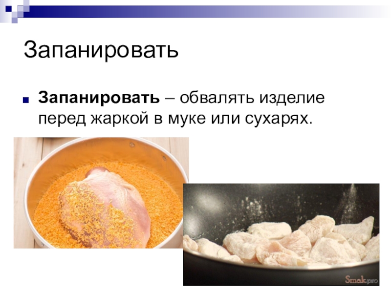 Запанировать – обвалять изделие перед жаркой в муке или сухарях.