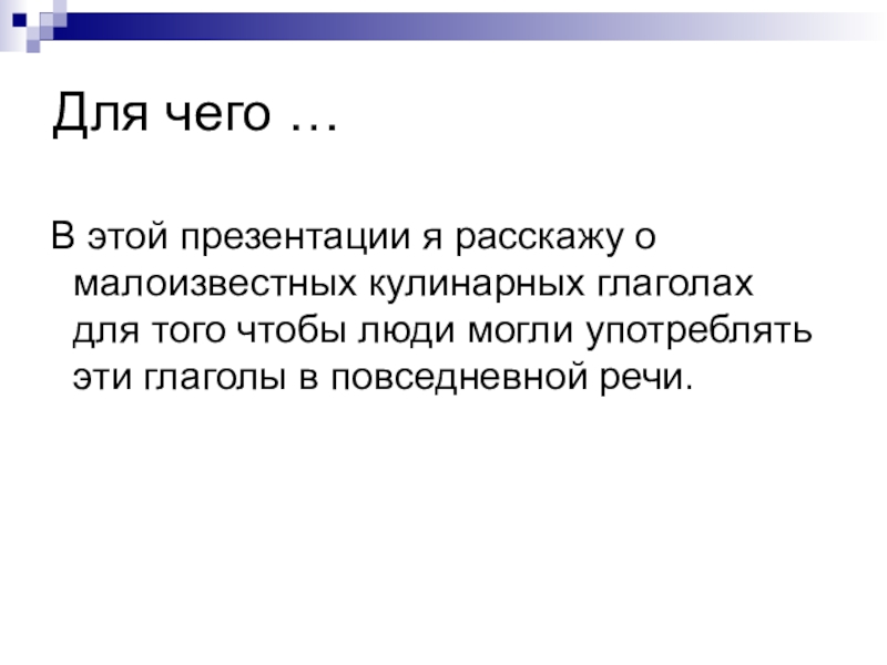 Для чего … В этой презентации я расскажу о малоизвестных кулинарных глаголах для того чтобы люди могли