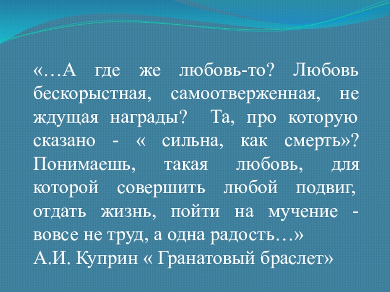 Слайд 4«…А где же любовь-то? Любовь бескорыстная, самоотверженная, не ждущая награды? Та,