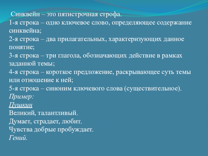 Слайд 9 Синквейн – это пятистрочная строфа.