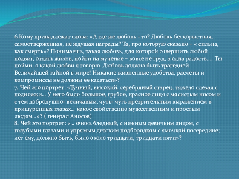 Слайд 86.Кому принадлежат слова: «А где же любовь - то? Любовь бескорыстная,