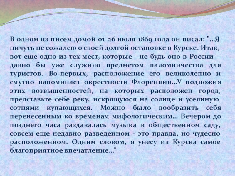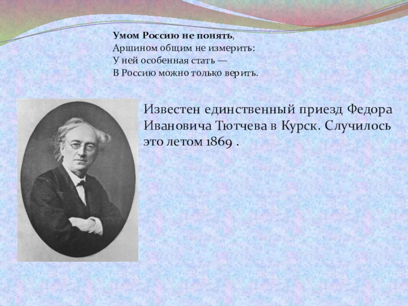Известен единственный приезд Федора Ивановича Тютчева в Курск. Случилось это летом 1869 .