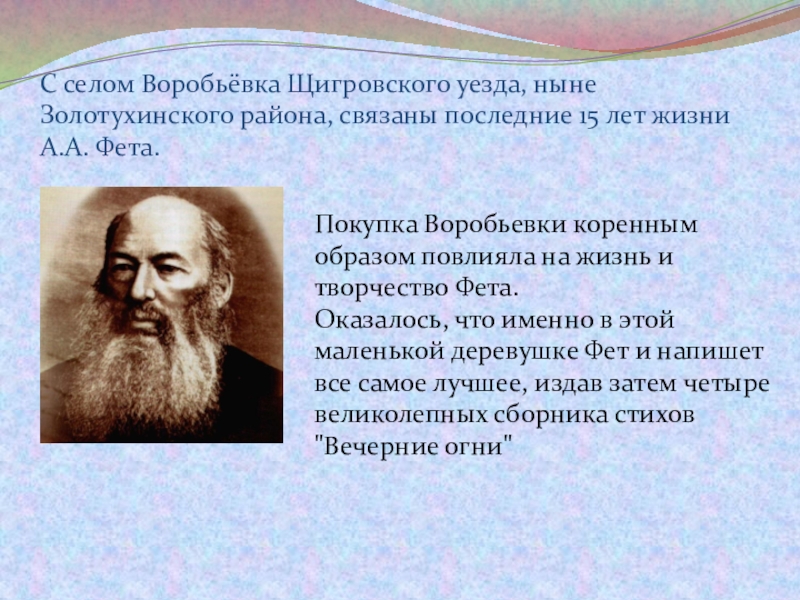 Покупка Воробьевки коренным образом повлияла на жизнь и творчество Фета.