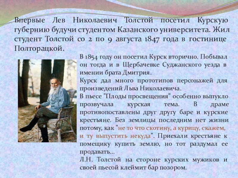 Л.Н. Толстой на стороне курских мужиков и своей пьесой клеймит бар позором.