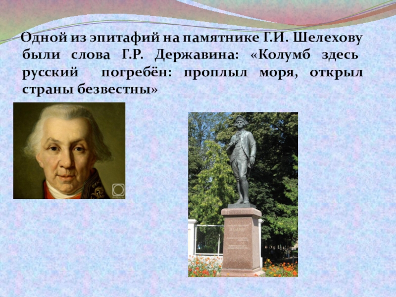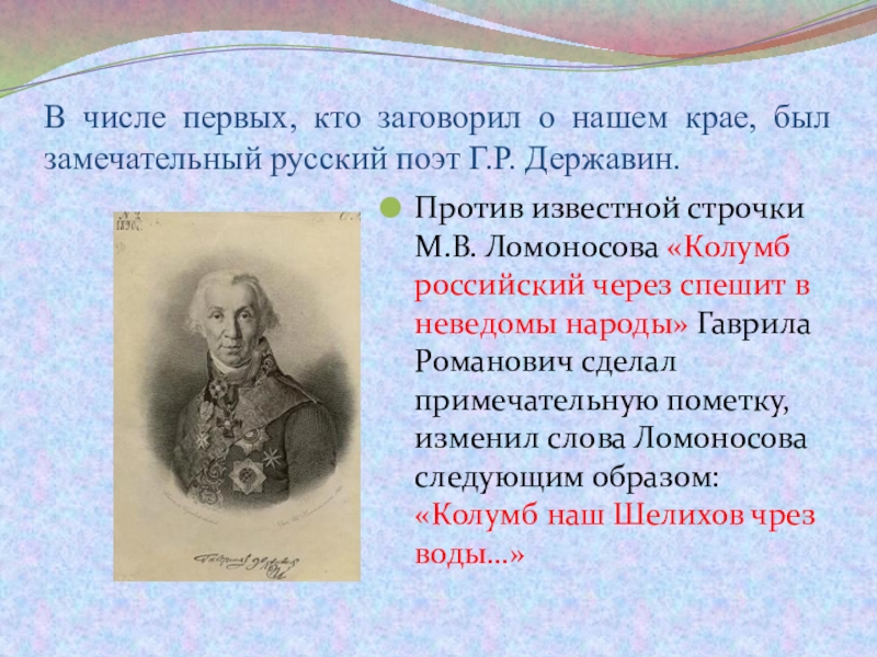 Против известной строчки М.В. Ломоносова «Колумб российский через спешит в неведомы народы» Гаврила Романович сделал примечательную пометку, изменил слова Ломоносова следующим образом: «Колумб наш Шелихов чрез воды…»