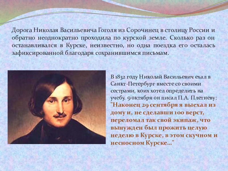 В 1832 году Николай Васильевич ехал в Санкт-Петербург вместе со своими сестрами, коих хотел определить на учебу. 9 октября он писал П.А. Плетневу: "Наконец 29 сентября я выехал из дому и, не сделавши 100 верст, переломал так свой экипаж, что вынужден был прожить целую неделю в Курске, в этом скучном и несносном Курске…"