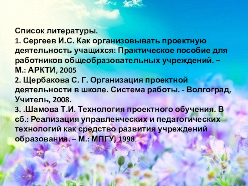 2. Щербакова С. Г. Организация проектной деятельности в школе. Система работы. - Волгоград, Учитель, 2008.