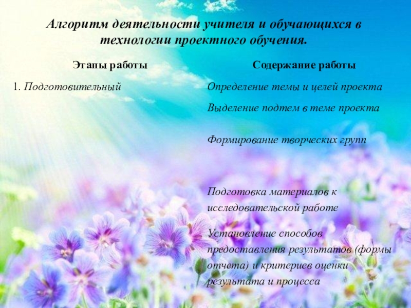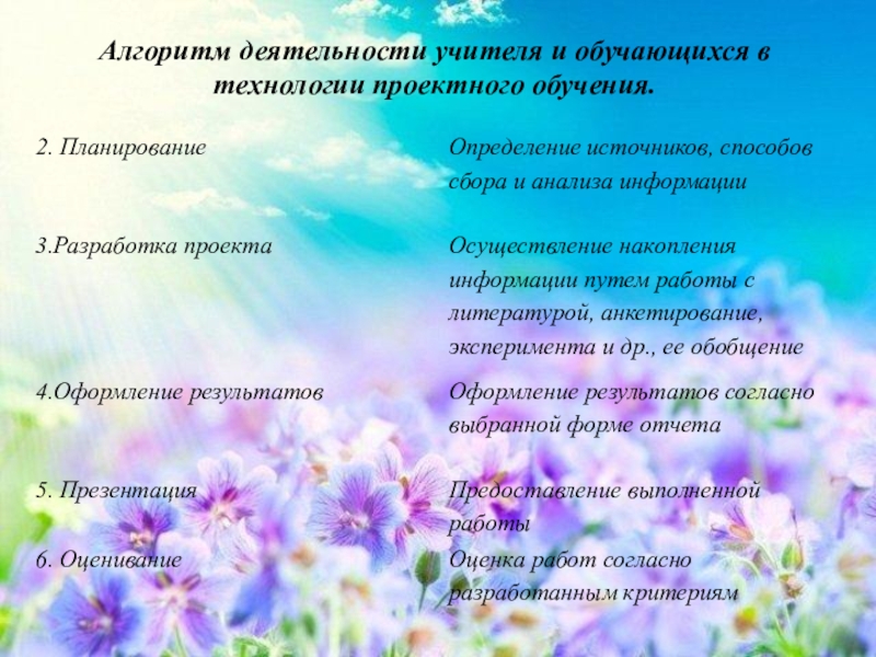 Слайд 8Алгоритм деятельности учителя и обучающихся в технологии проектного обучения.