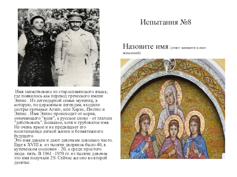 Имя заимствовано из старославянского языка, где появилось как перевод греческого имени Элпис . Из легендарной семьи мучениц, в которую, по церковным легендам, входили сестры-гречанки Агапэ, или Харис, Пистис и Элпис . Имя Элпис происходит от корня, означающего "воля", а русское слово - от глагола "действовать". Большое, хотя и грубоватое имя. Не очень яркое и не предвещает его носительнице легкой жизни и безмятежного будущего.