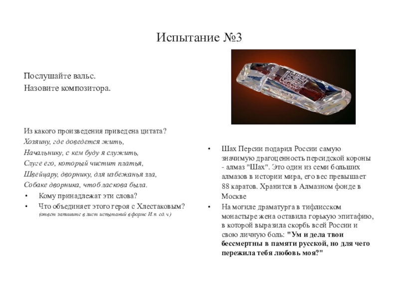 Шах Персии подарил России самую значимую драгоценность персидской короны - алмаз "Шах". Это один из семи больших алмазов в истории мира, его вес превышает 88 каратов. Хранится в Алмазном фонде в Москве