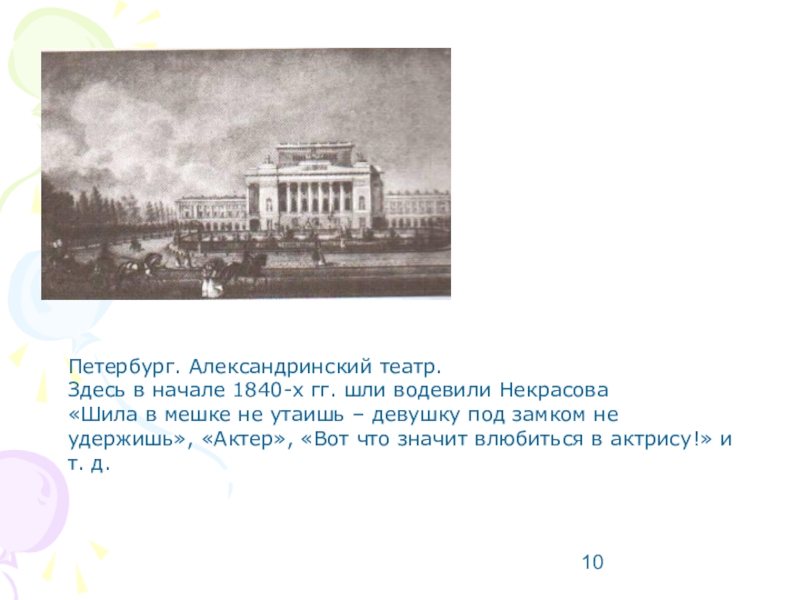 Здесь в начале 1840-х гг. шли водевили Некрасова