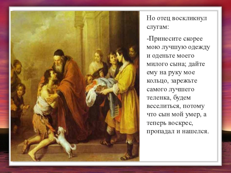 милого сына; дайте ему на руку мое кольцо, зарежьте самого лучшего теленка, будем веселиться, потому что сын мой умер, а теперь воскрес, пропадал и нашелся.