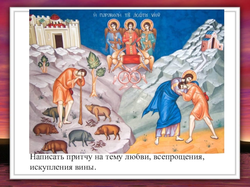 Слайд 15Написать притчу на тему любви, всепрощения, искупления вины.