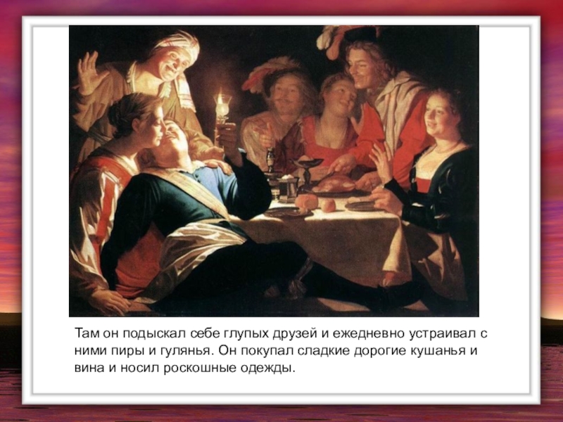 пиры и гулянья. Он покупал сладкие дорогие кушанья и вина и носил роскошные одежды.