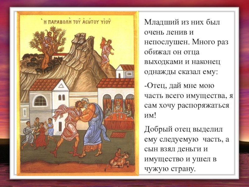 Добрый отец выделил ему следуемую часть, а сын взял деньги и имущество и ушел в чужую страну.