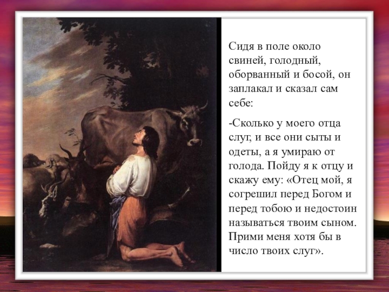 Слайд 9Сидя в поле около свиней, голодный, оборванный и босой, он заплакал