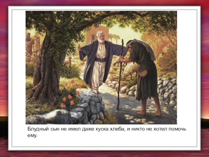 Слайд 7Блудный сын не имел даже куска хлеба, и никто не хотел
