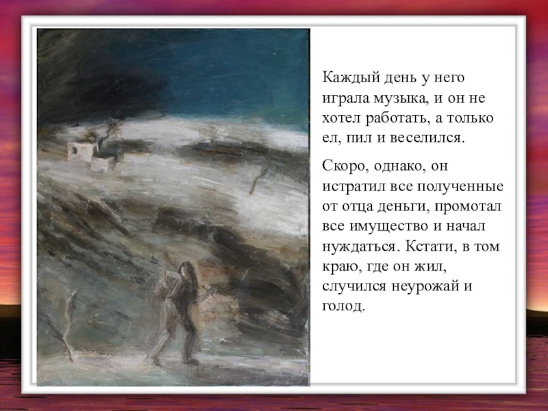 Скоро, однако, он истратил все полученные от отца деньги, промотал все имущество и начал нуждаться. Кстати, в том краю, где он жил, случился неурожай и голод.