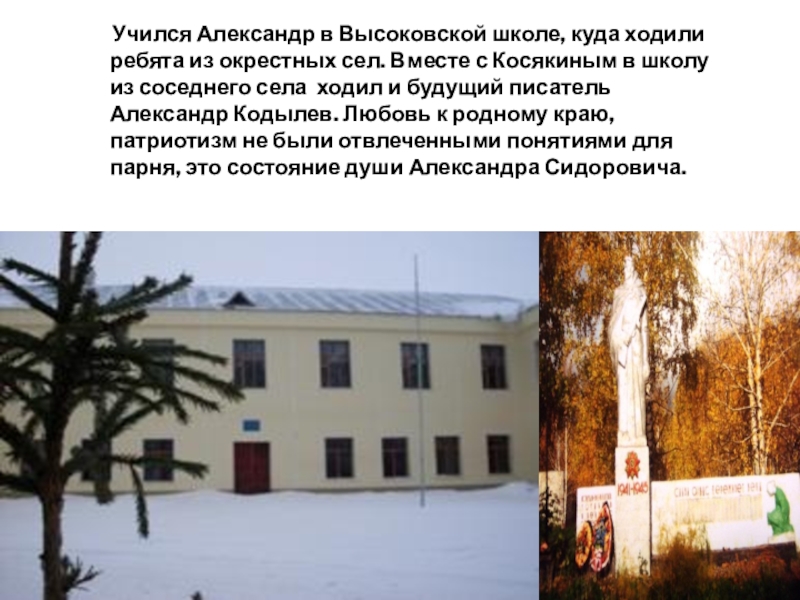ходили ребята из окрестных сел. Вместе с Косякиным в школу из соседнего села ходил и будущий писатель Александр Кодылев. Любовь к родному краю, патриотизм не были отвлеченными понятиями для парня, это состояние души Александра Сидоровича.