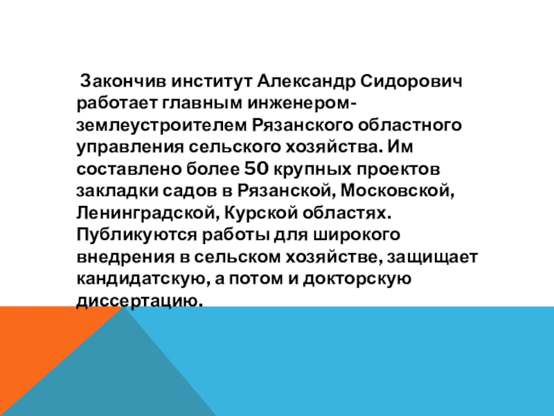 Слайд 18 Закончив институт Александр Сидорович работает главным инженером-землеустроителем