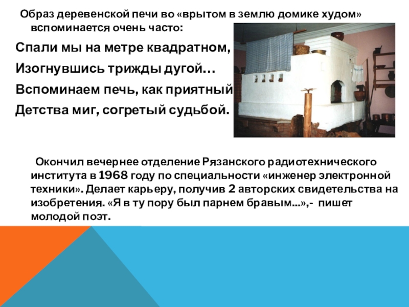 Образ деревенской печи во «врытом в землю домике худом» вспоминается