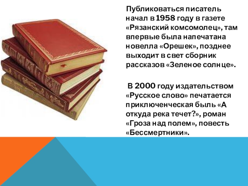 Слайд 19 Публиковаться писатель начал в 1958 году в газете