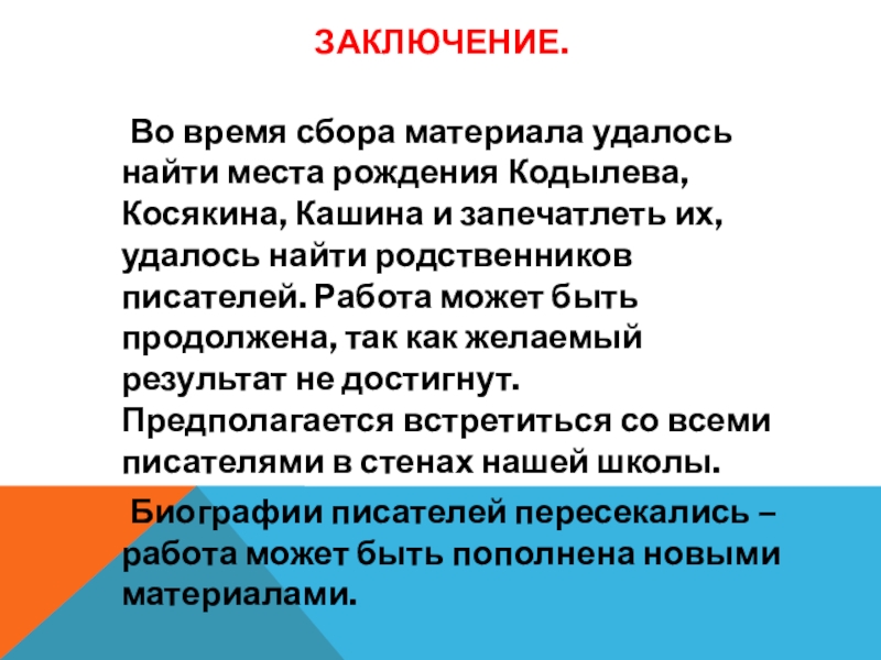 Кодылева, Косякина, Кашина и запечатлеть их, удалось найти родственников писателей. Работа может быть продолжена, так как желаемый результат не достигнут. Предполагается встретиться со всеми писателями в стенах нашей школы.