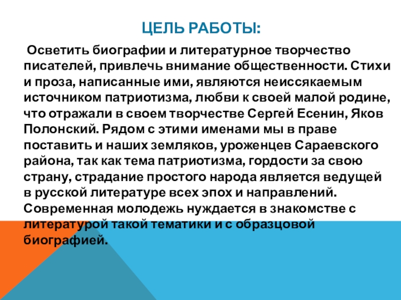 привлечь внимание общественности. Стихи и проза, написанные ими, являются неиссякаемым источником патриотизма, любви к своей малой родине, что отражали в своем творчестве Сергей Есенин, Яков Полонский. Рядом с этими именами мы в праве поставить и наших земляков, уроженцев Сараевского района, так как тема патриотизма, гордости за свою страну, страдание простого народа является ведущей в русской литературе всех эпох и направлений. Современная молодежь нуждается в знакомстве с литературой такой тематики и с образцовой биографией.