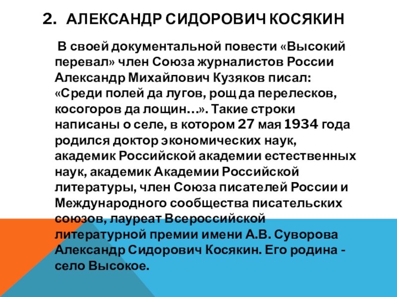 документальной повести «Высокий перевал» член Союза журналистов России Александр Михайлович Кузяков писал: «Среди полей да лугов, рощ да перелесков, косогоров да лощин…». Такие строки написаны о селе, в котором 27 мая 1934 года родился доктор экономических наук, академик Российской академии естественных наук, академик Академии Российской литературы, член Союза писателей России и Международного сообщества писательских союзов, лауреат Всероссийской литературной премии имени А.В. Суворова Александр Сидорович Косякин. Его родина - село Высокое.
