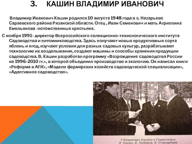 Рязанского областного управления сельского хозяйства. Им составлено более 50 крупных проектов закладки садов в Рязанской, Московской, Ленинградской, Курской областях. Публикуются работы для широкого внедрения в сельском хозяйстве, защищает кандидатскую, а потом и докторскую диссертацию.