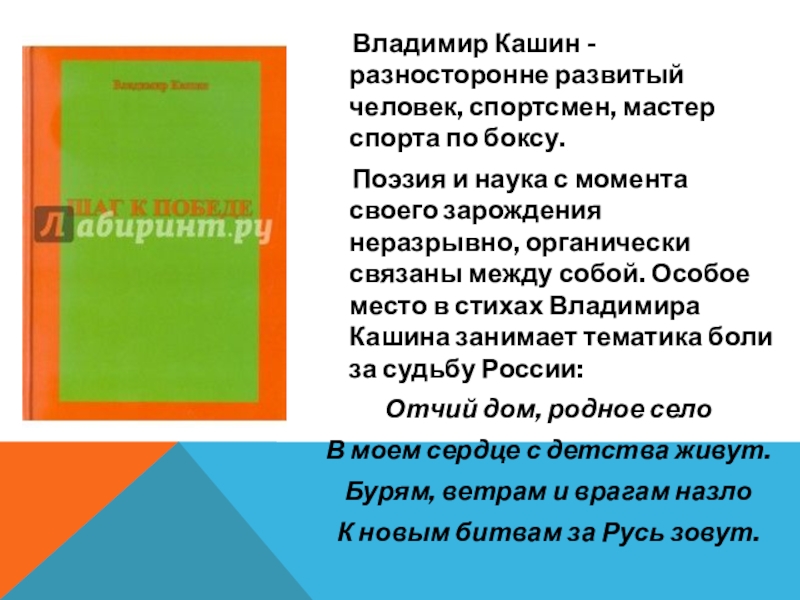 Поэзия и наука с момента своего зарождения неразрывно, органически связаны между собой. Особое место в стихах Владимира Кашина занимает тематика боли за судьбу России: