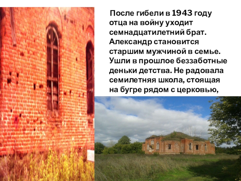 уходит семнадцатилетний брат. Александр становится старшим мужчиной в семье. Ушли в прошлое беззаботные деньки детства. Не радовала семилетняя школа, стоящая на бугре рядом с церковью, звон колоколов теперь уже звучал зловеще.