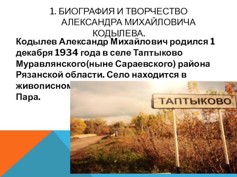 Кодылев Александр Михайлович родился 1 декабря 1934 года в селе Таптыково Муравлянского(ныне Сараевского) района Рязанской области. Село находится в живописном месте на правом берегу реки Пара.