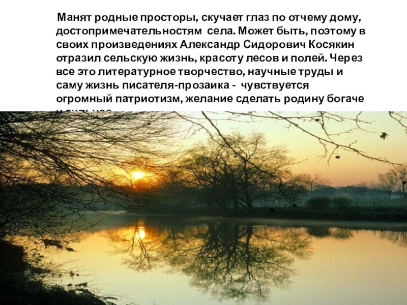отчему дому, достопримечательностям села. Может быть, поэтому в своих произведениях Александр Сидорович Косякин отразил сельскую жизнь, красоту лесов и полей. Через все это литературное творчество, научные труды и саму жизнь писателя-прозаика - чувствуется огромный патриотизм, желание сделать родину богаче и сильнее.