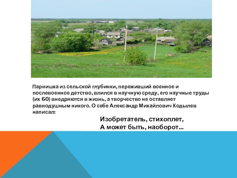 послевоенное детство, влился в научную среду, его научные труды(их 60) внедряются в жизнь, а творчество не оставляет равнодушным никого. О себе Александр Михайлович Кодылев написал: