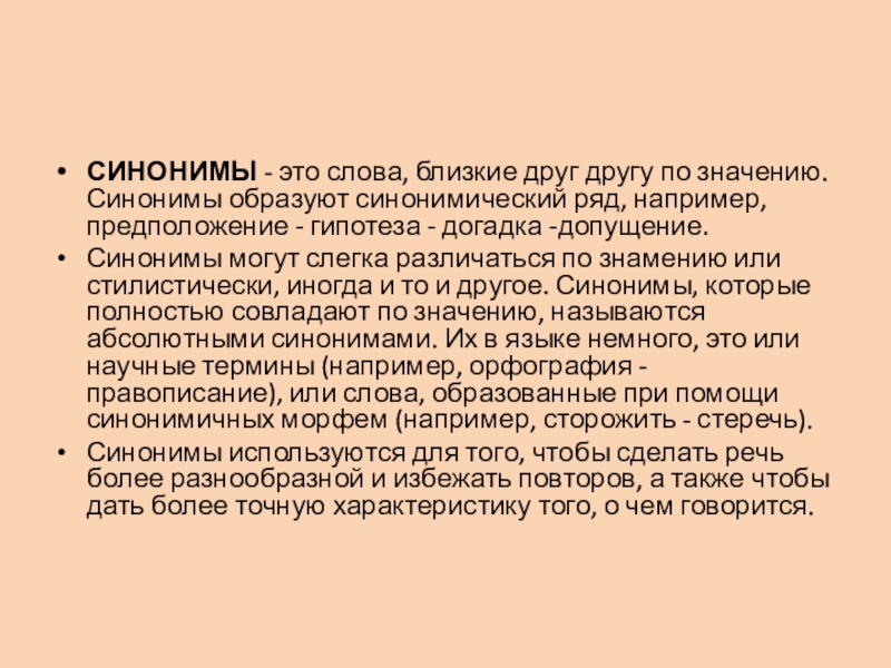 Синонимы могут слегка различаться по знамению или стилистически, иногда и то и другое. Синонимы, которые полностью совладают по значению, называются абсолютными синонимами. Их в языке немного, это или научные термины (например, орфография - правописание), или слова, образованные при помощи синонимичных морфем (например, сторожить - стеречь).