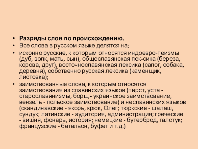русские, к которым относятся индоевро-пеизмы (дуб, волк, мать, сын), общеславянская пек-сика (береза, корова, друг), восточнославянская лексика (сапог, собака, деревня), собственно русская лексика (каменщик, листовка);