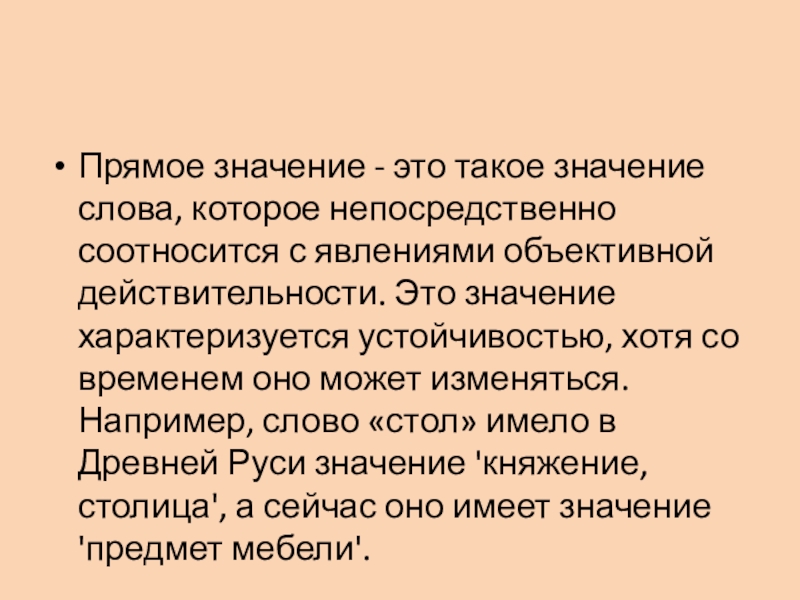 явлениями объективной действительности. Это значение характеризуется устойчивостью, хотя со временем оно может изменяться. Например, слово «стол» имело в Древней Руси значение 'княжение, столица', а сейчас оно имеет значение 'предмет мебели'.