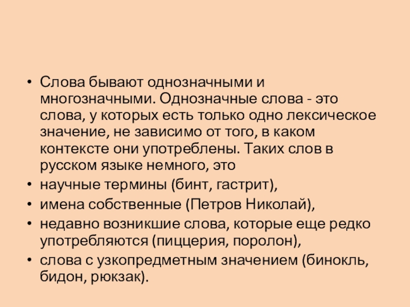 которых есть только одно лексическое значение, не зависимо от того, в каком контексте они употреблены. Таких слов в русском языке немного, это