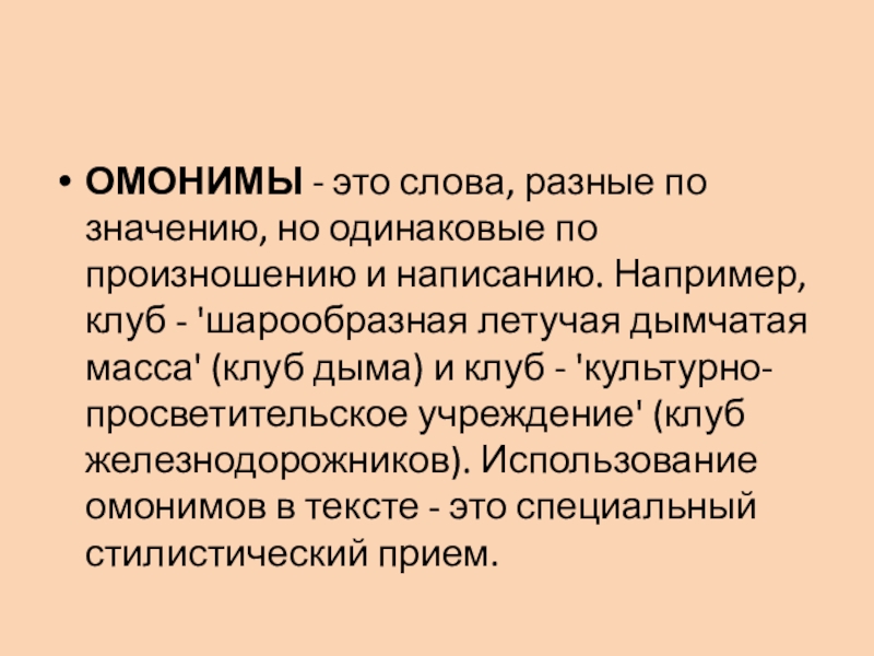 и написанию. Например, клуб - 'шарообразная летучая дымчатая масса' (клуб дыма) и клуб - 'культурно-просветительское учреждение' (клуб железнодорожников). Использование омонимов в тексте - это специальный стилистический прием.