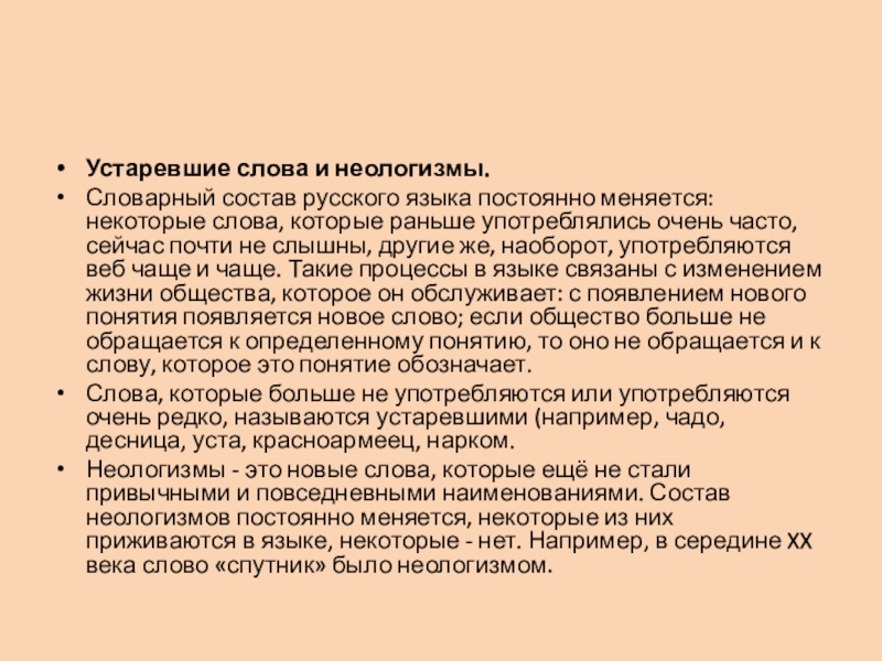 Слова, которые больше не употребляются или употребляются очень редко, называются устаревшими (например, чадо, десница, уста, красноармеец, нарком.