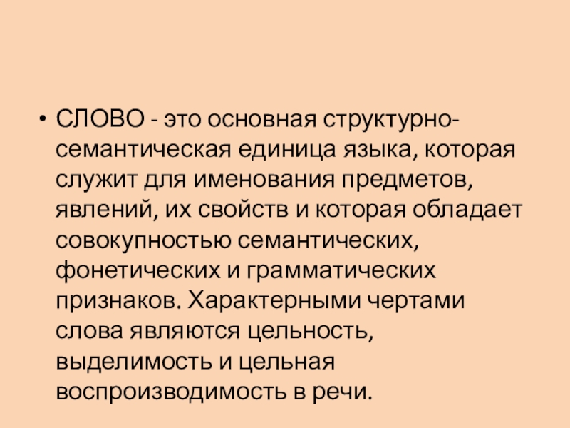 предметов, явлений, их свойств и которая обладает совокупностью семантических, фонетических и грамматических признаков. Характерными чертами слова являются цельность, выделимость и цельная воспроизводимость в речи.