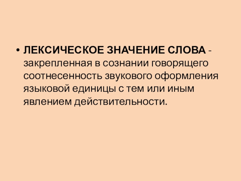 Слайд 6ЛЕКСИЧЕСКОЕ ЗНАЧЕНИЕ СЛОВА - закрепленная в сознании говорящего соотнесенность звукового оформления