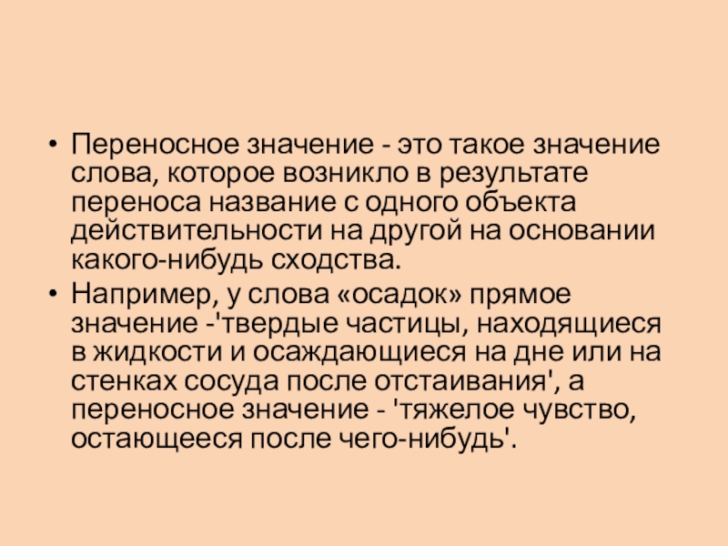 Например, у слова «осадок» прямое значение -'твердые частицы, находящиеся в жидкости и осаждающиеся на дне или на стенках сосуда после отстаивания', а переносное значение - 'тяжелое чувство, остающееся после чего-нибудь'.