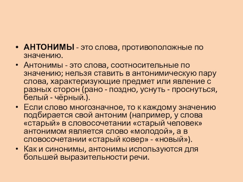 Если слово многозначное, то к каждому значению подбирается свой антоним (например, у слова «старый» в словосочетании «старый человек»антонимом является слово «молодой», а в словосочетании «старый ковер» - «новый»).