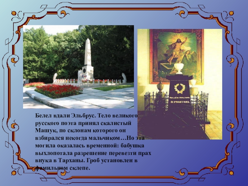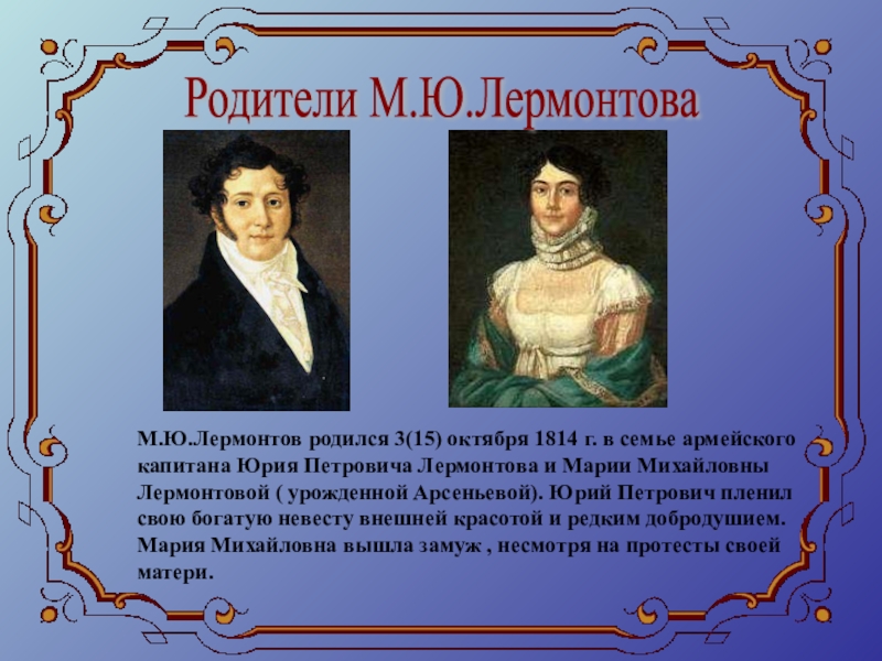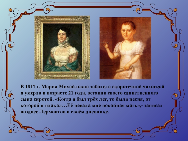 Семейная драма наложила отпечаток на характер Лермонтова. Сердце мальчика разрывалось между доброй бабушкой и любимым отцом.