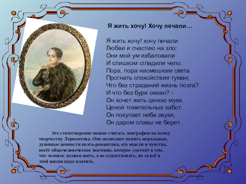 Это стихотворение можно считать эпиграфом ко всему творчеству Лермонтова. Оно позволяет понять моральные, духовные ценности поэта-романтика, его мысли и чувства, несёт общечеловеческое значение, которое состоит в том, что человек должен жить, а не существовать, но за всё в этой жизни надо платить.