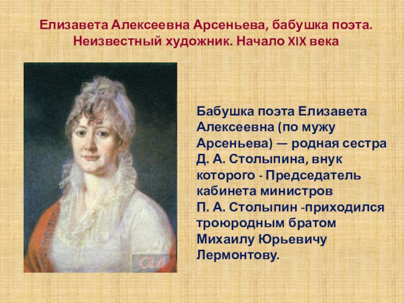 Слайд 6Бабушка поэта Елизавета Алексеевна (по мужу Арсеньева) — родная сестра